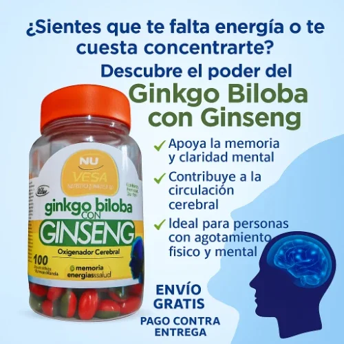 ¡Potencia tu mente y cuerpo con la combinación perfecta! 🧠✨ Este suplemento de Ginkgo Biloba con Ginseng actúa como un poderoso oxigenador cerebral, diseñado para mejorar tu memoria y darte ese impulso de energía natural que necesitas en tu día a día. 🚀 Ya sea para concentrarte en el trabajo o mantenerte activo, es el aliado ideal para tu bienestar y salud mental. 🌿💪 ¡Dale a tu cerebro el combustible que merece! 💎🔋