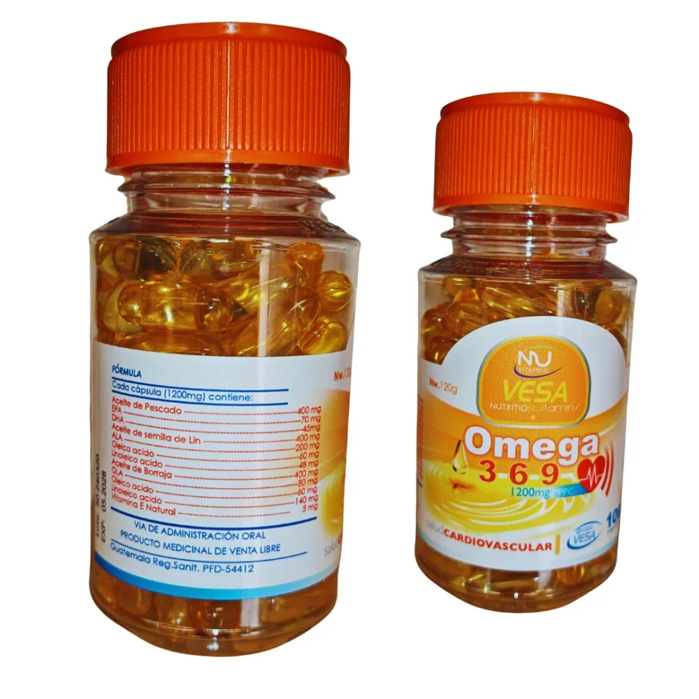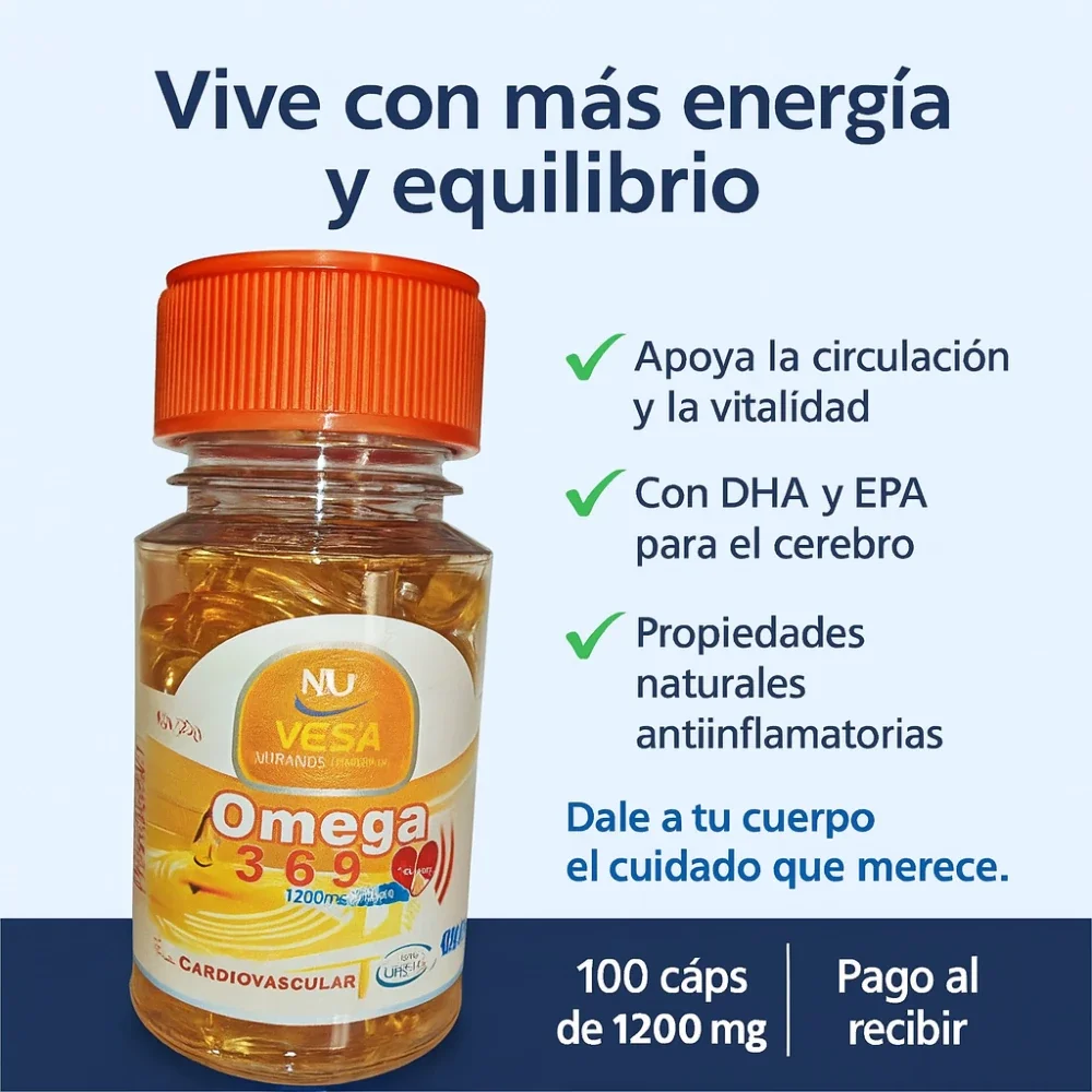 ¡Dale a tu cuerpo el combustible premium que merece con Omega 3-6-9 de Nu Vesa! 🌟 Este potente suplemento de 1200 mg es tu aliado perfecto para un corazón de hierro ❤️ y una mente brillante 🧠. Sus cápsulas blandas están cargadas de ácidos grasos esenciales que no solo protegen tu salud cardiovascular y regulan el colesterol, sino que también combaten la inflamación, fortalecen tus defensas y hacen que tu piel y cabello luzcan radiantes ✨. ¡Cuida tu bienestar integral con la pureza y calidad que solo Nu Vesa Nutrition te ofrece! 🚀💊